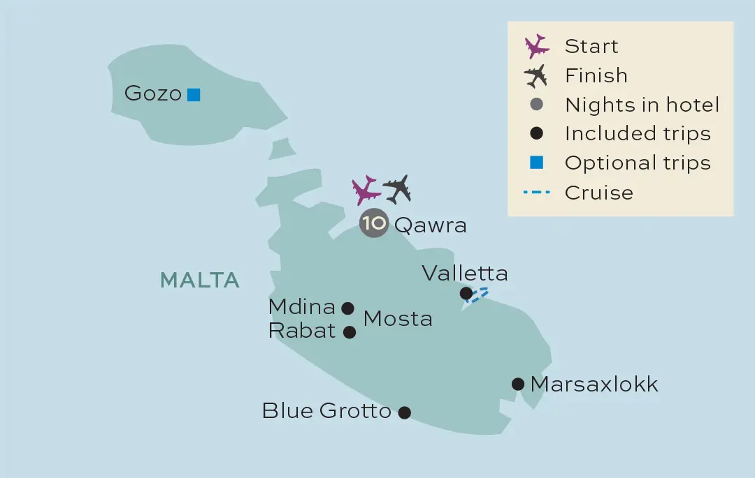 You can choose to spend today at your hotel or enjoy exploring more of Malta. Alternatively, you can join our optional excursion to Malta's sister island Gozo, which we'll reach by a short ferry crossing. You'll notice that Gozo is much greener than Malta and has certain differing characteristics. On arrival, we will be met by a Local Guide and start our tour that includes a visit to shrine of Ta' Pinu. This important church is set in a stunning location on the edge of a ridge in open countryside, and provides beautiful views of the surrounding area. Another stop is the area known as 'Dwejra'. Here, you'll explore interesting geological sites including Dwejra Bay and the Inland Sea – a lagoon of seawater accessible to the open sea via a small tunnel through the cliff. There will be a short walk through the busy little city of Victoria, known locally as Rabat and the Cittadellla - a small walled city within the city, where only a small number of families still live. Upon return to the ferry port of Gozo, we will pass through some small villages, and if time allows, stop at Qala Belvedere where there is an amazing scenic view of the landscape cascading down to the coast, with the smallest island of Comino in the distance. Our tour will then head back to the ferry for our return to Malta and transfer back to the hotel.