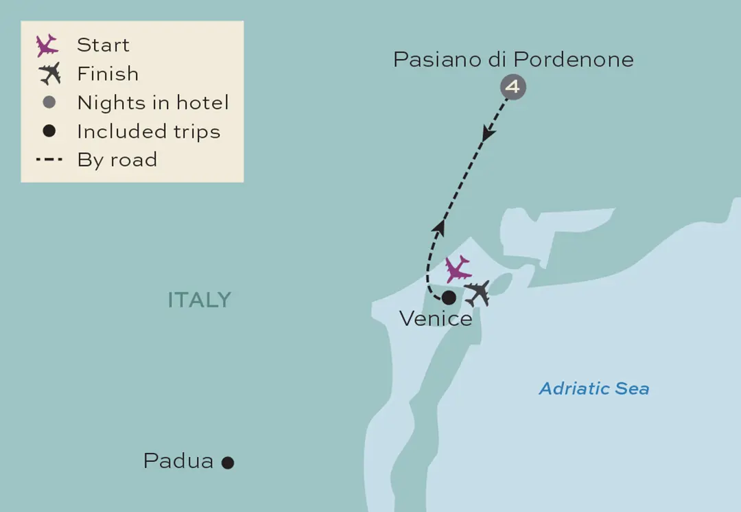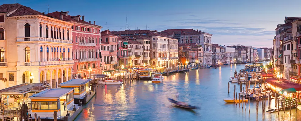 Today we're going to head to the extraordinary floating city of Venice for a guided tour. We'll see famous landmarks, starting in St Mark's Square, which is dominated by the Church of St Mark and is Venice's focal point. We'll also see the magnificent Doge's Palace and cross the Rialto Bridge, which spans the Grand Canal, where we can watch gondolas glide beneath us. The city is a mesmerising sight at any time of the year but it is even more magical when it is illuminated by sparkling lights.